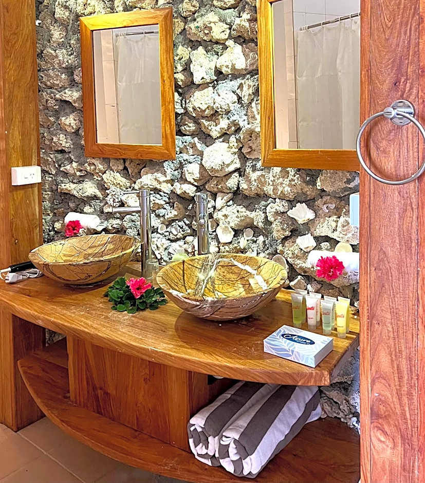 This bungalow features partial ocean views, handcrafted hardwood and wicker furniture, a refrigerator and a unique coral bathroom.